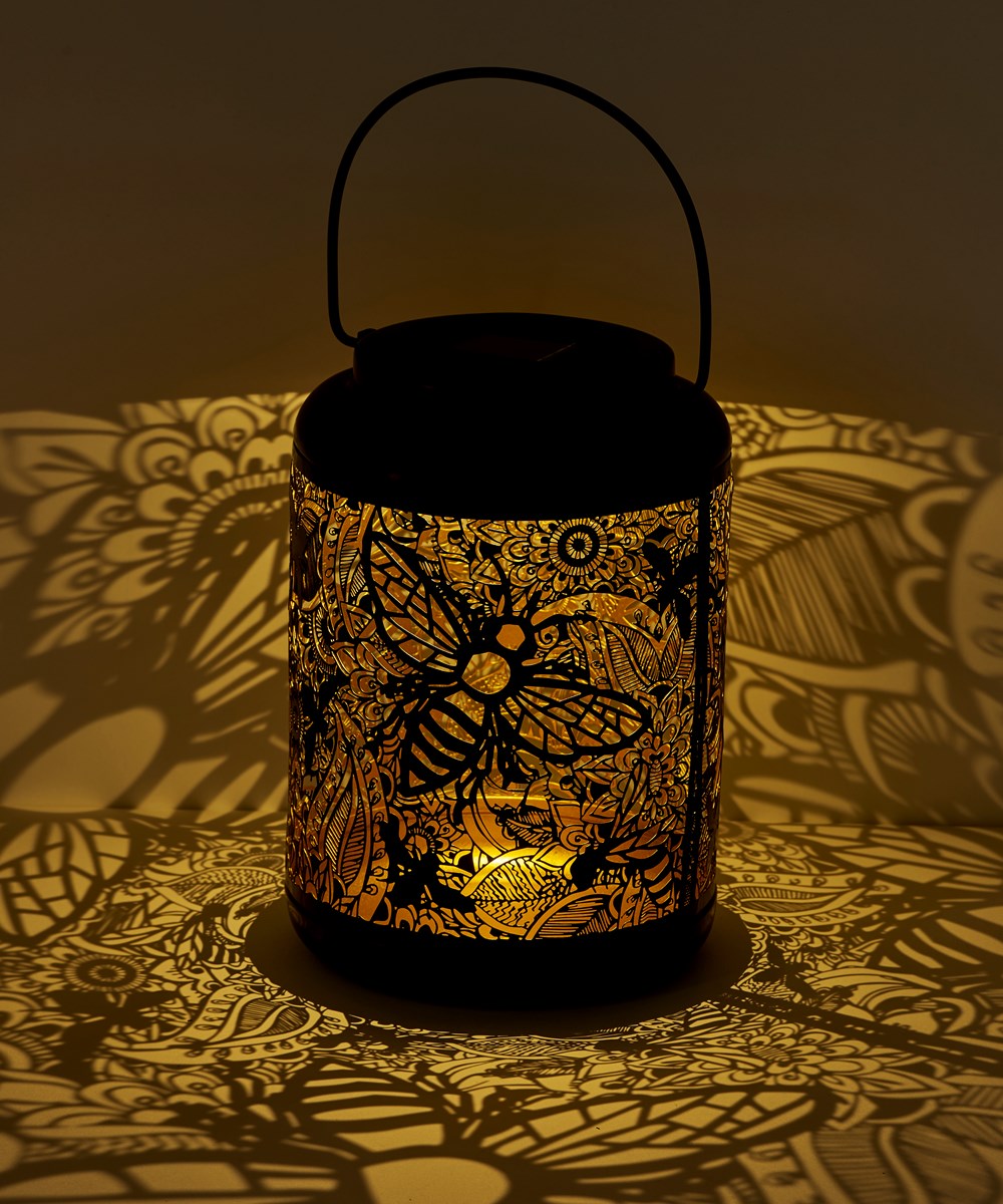 Outdoor solar decorative lights are perfect for adding illuminated patterns to the ground, floor or tabletop from these Shadow Lanterns. Laser cut patterns in the metal create a mesmerizing decorative glow from the LED solar light that shines on reflective paint inside the lantern. This solar lantern can be hung in trees, on a shepherds hook, from an outdoor pergola or it can sit on a patio table in any outdoor living area. This item is perfect for your garden or as a gift for loved ones or for someone who loves their garden.