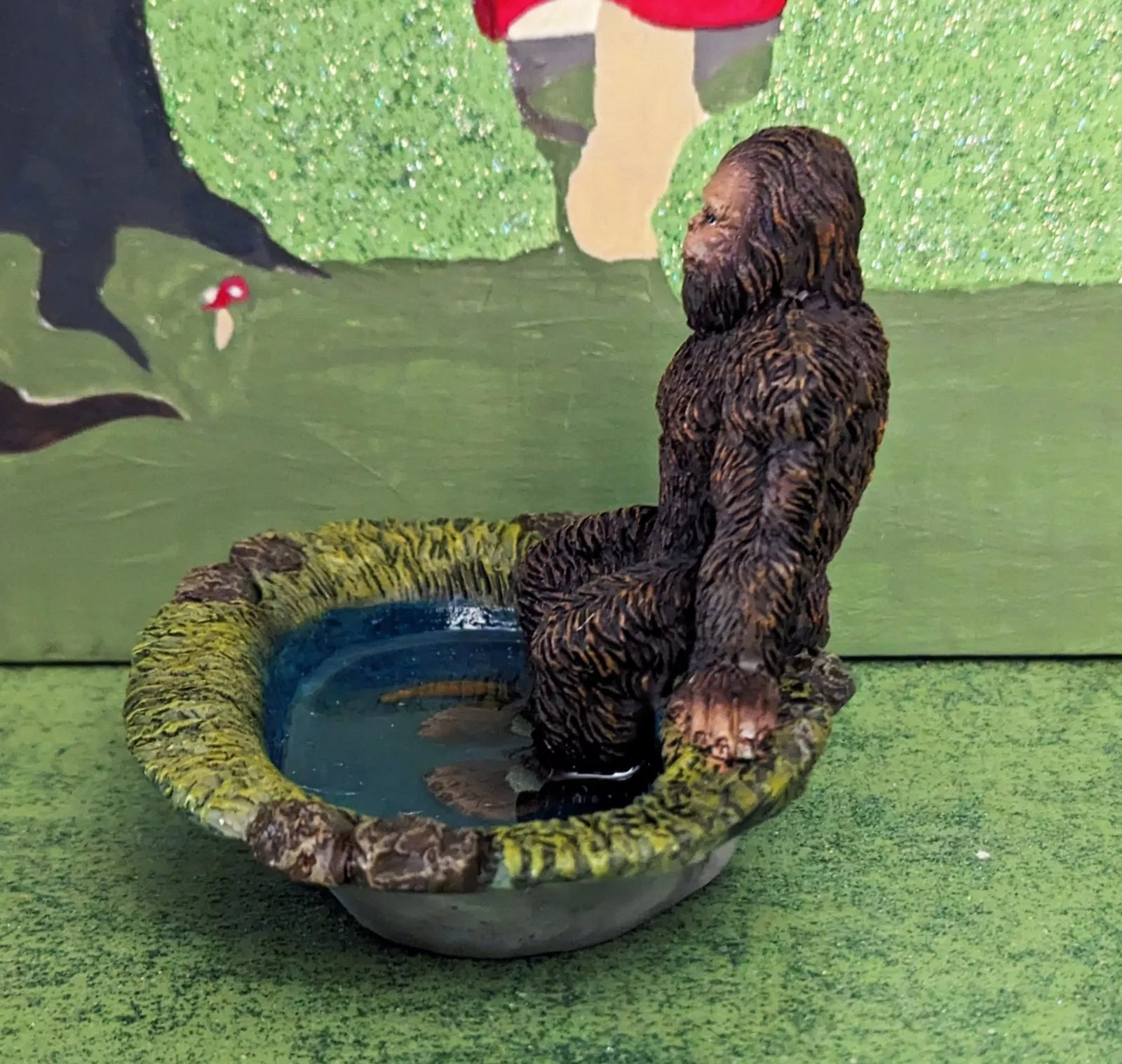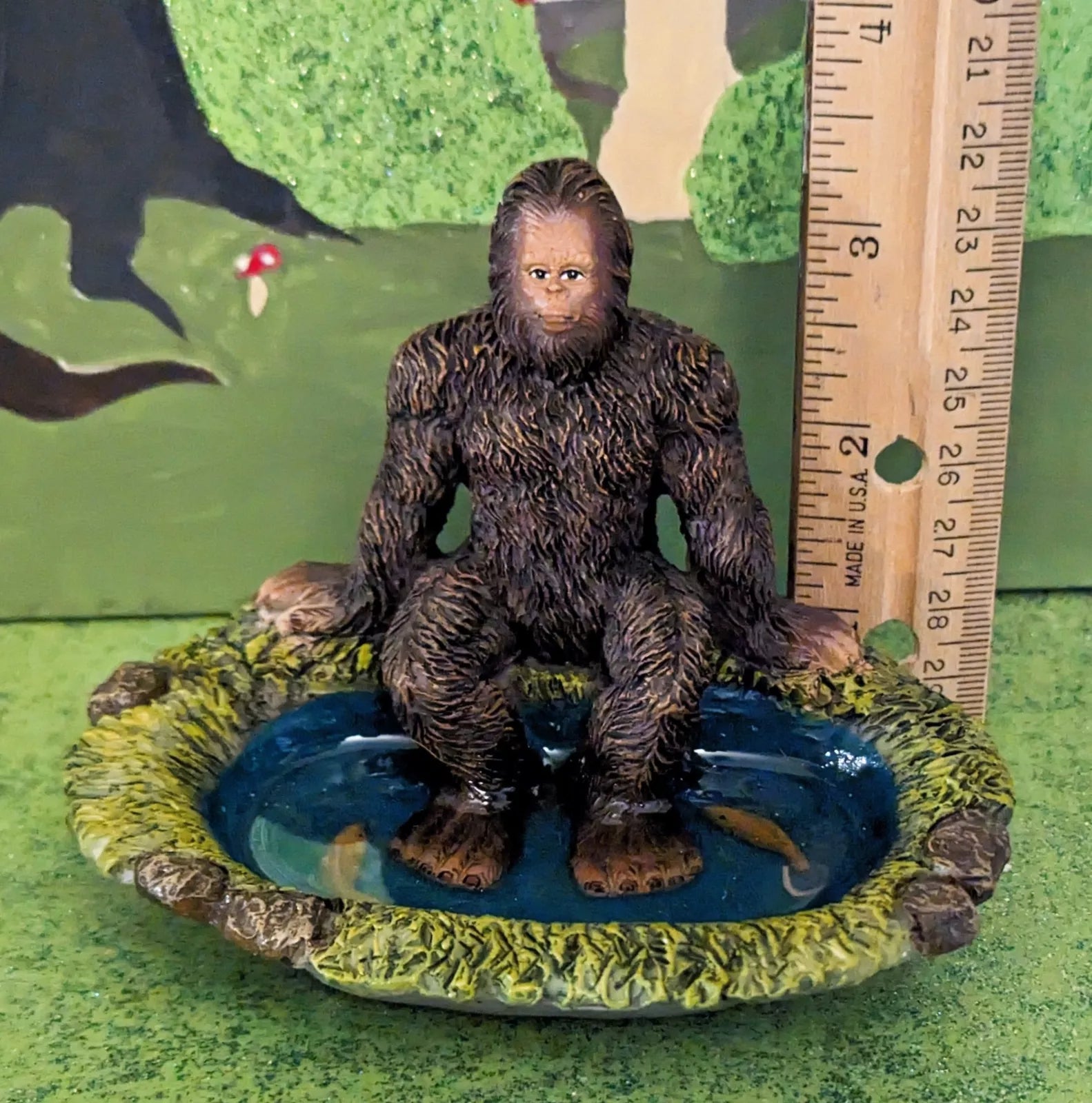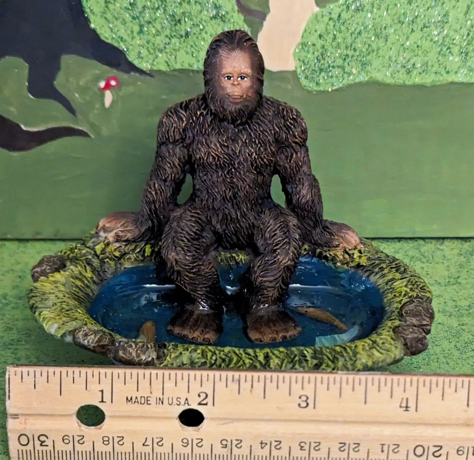 This miniature figurine features Bigfoot relaxing as he soaks his feet in a serene, moss-rimmed pond, accompanied by two playful fish. Perfect for nature lovers and collectors alike, this charming piece adds a touch of whimsy to any setting. Bring home this delightful scene and let Bigfoot remind you to take a moment to unwind in nature!