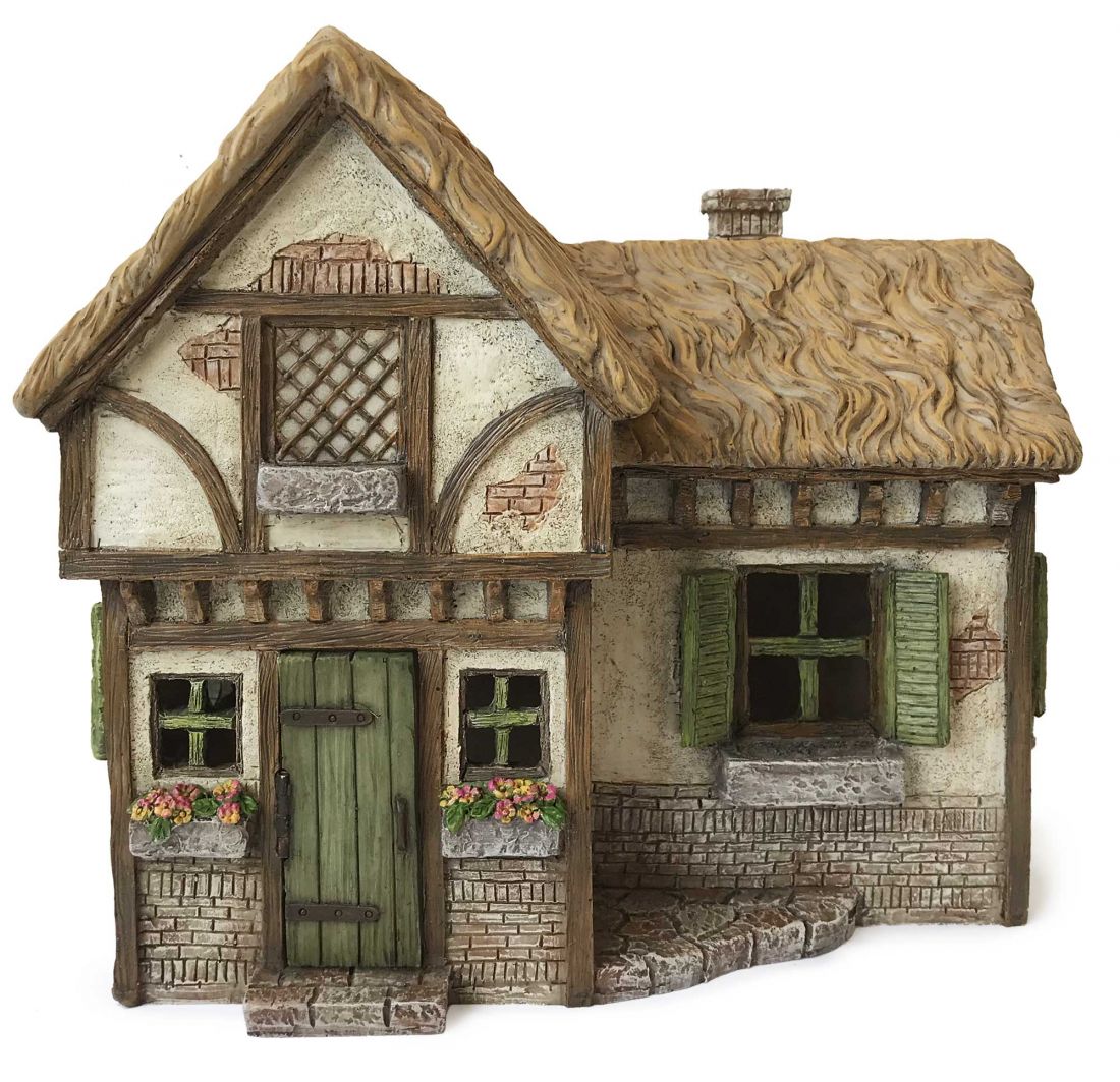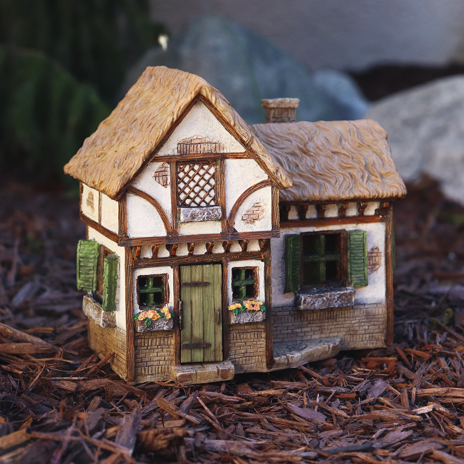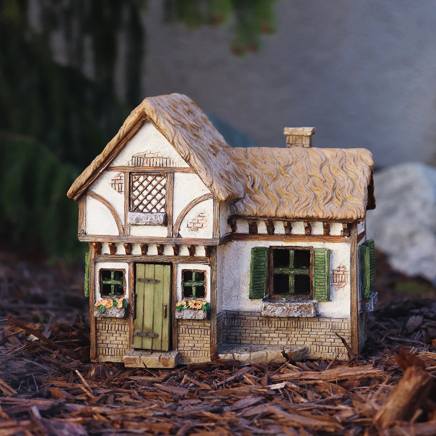Step back in time each time you step into your fairy garden when you add this Bristol house figure. Designed to emulate classic timber framed and Tudor styled buildings, it has a thatched rooftop, half-timbered upper level with lattice windows and stucco siding, and a lower level that combines stone and brickwork along with timber work and other appealing accents.