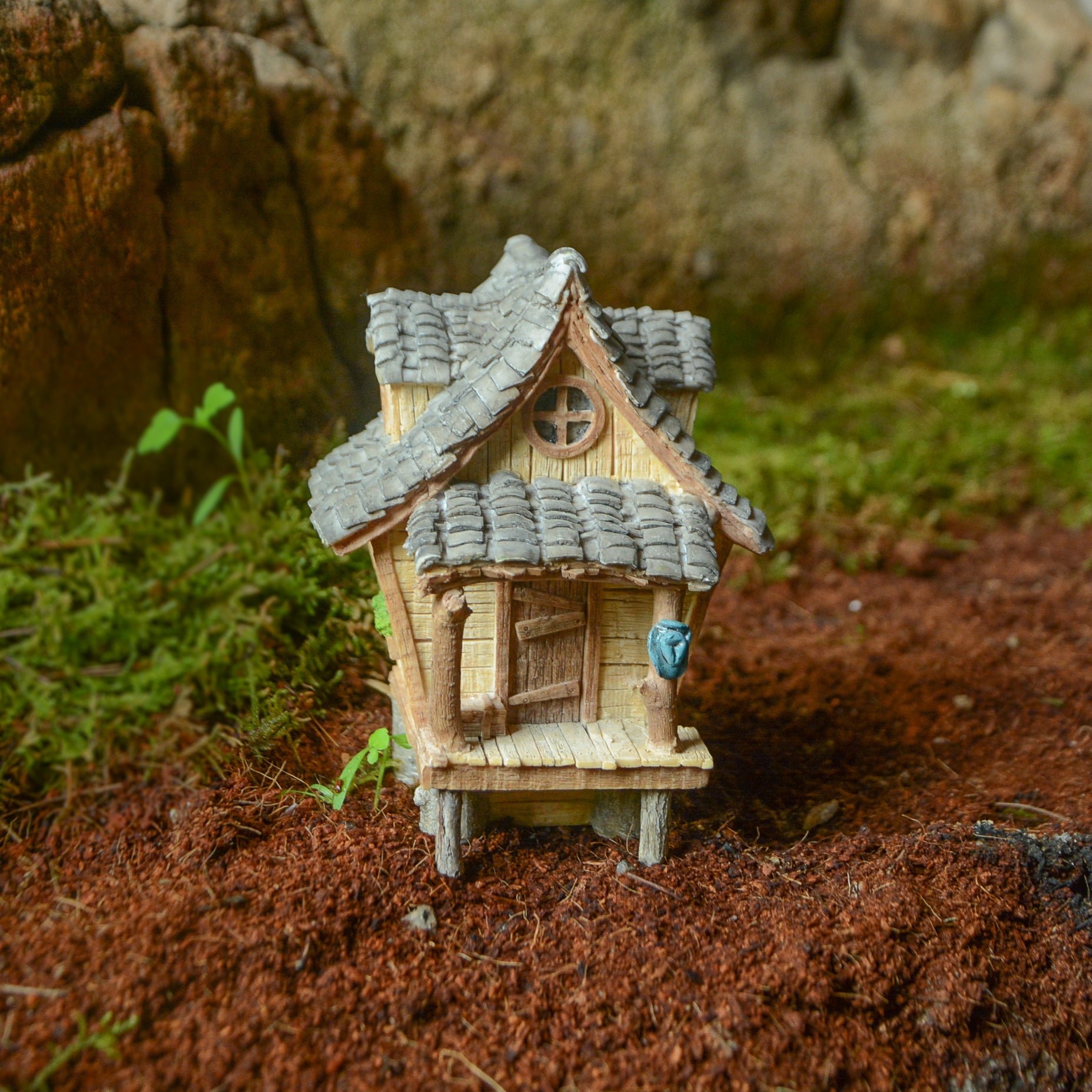 A simple front porch extends from the cabin, where a tiny blue hat hangs—perhaps left behind by a visiting sprite. Though the door doesn’t open, the whimsical design and thoughtful details make this a magical addition to any fairy garden or woodland scene.