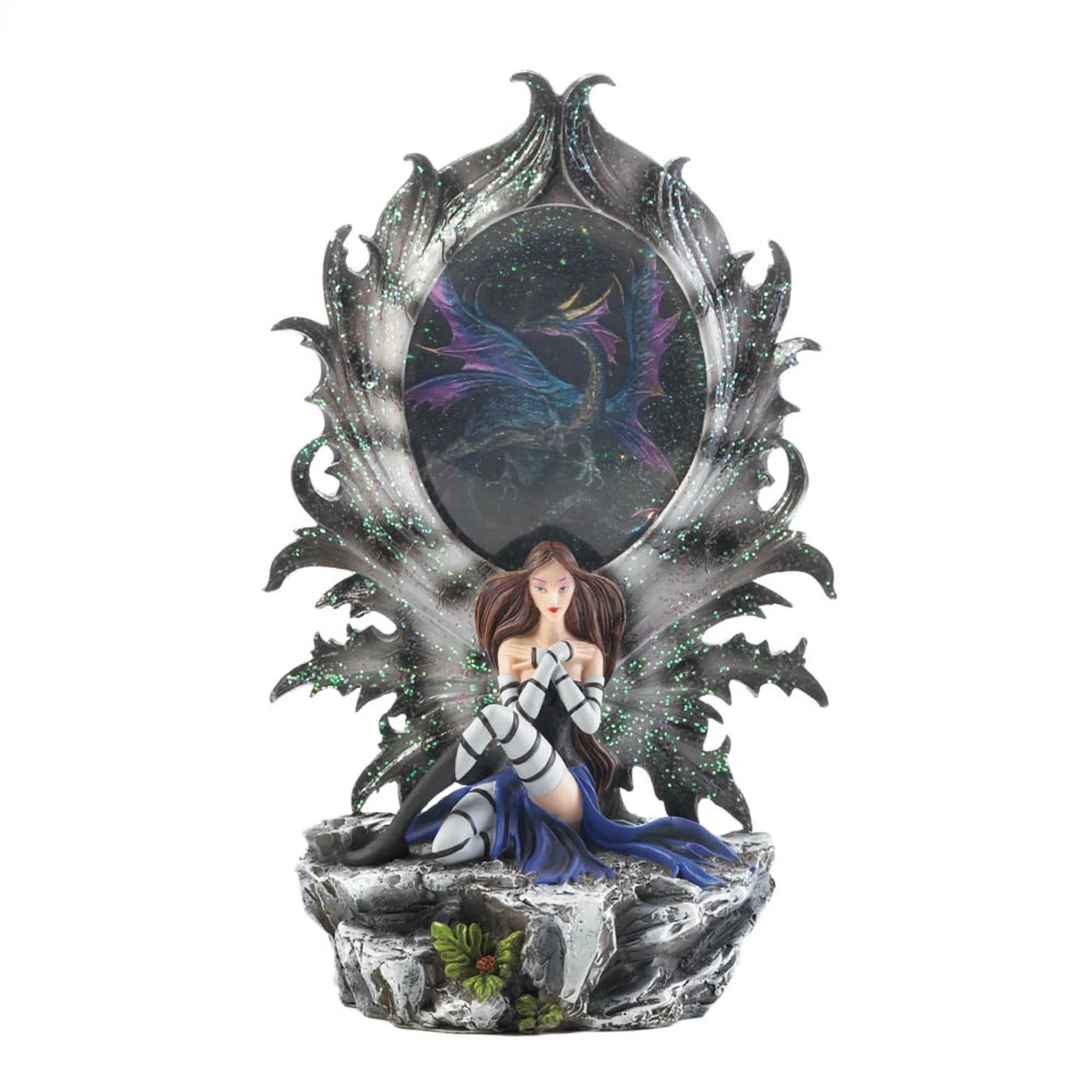This otherworldly décor accent will shimmer with mystical style on your shelf or desk. The amazing design features a pretty fairy resting against a dragon portal that lights up with the flip of a switch. This mesmerizing décor piece is an excellent gift and will look stunning perched on a shelf, desk, or table.