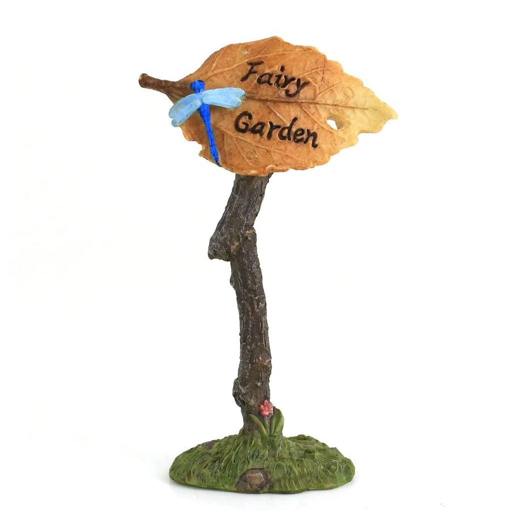 This fairy garden decoration is unlike any normal sign, in that it is made from a leaf attached to a stick! The sign bears the appearance of a stick that has been driven into the ground, with an orange autumn leaf on it that reads Fairy Garden in neat letters. A blue dragonfly rests on the leaf, adding a bit of cool color to the signpost.