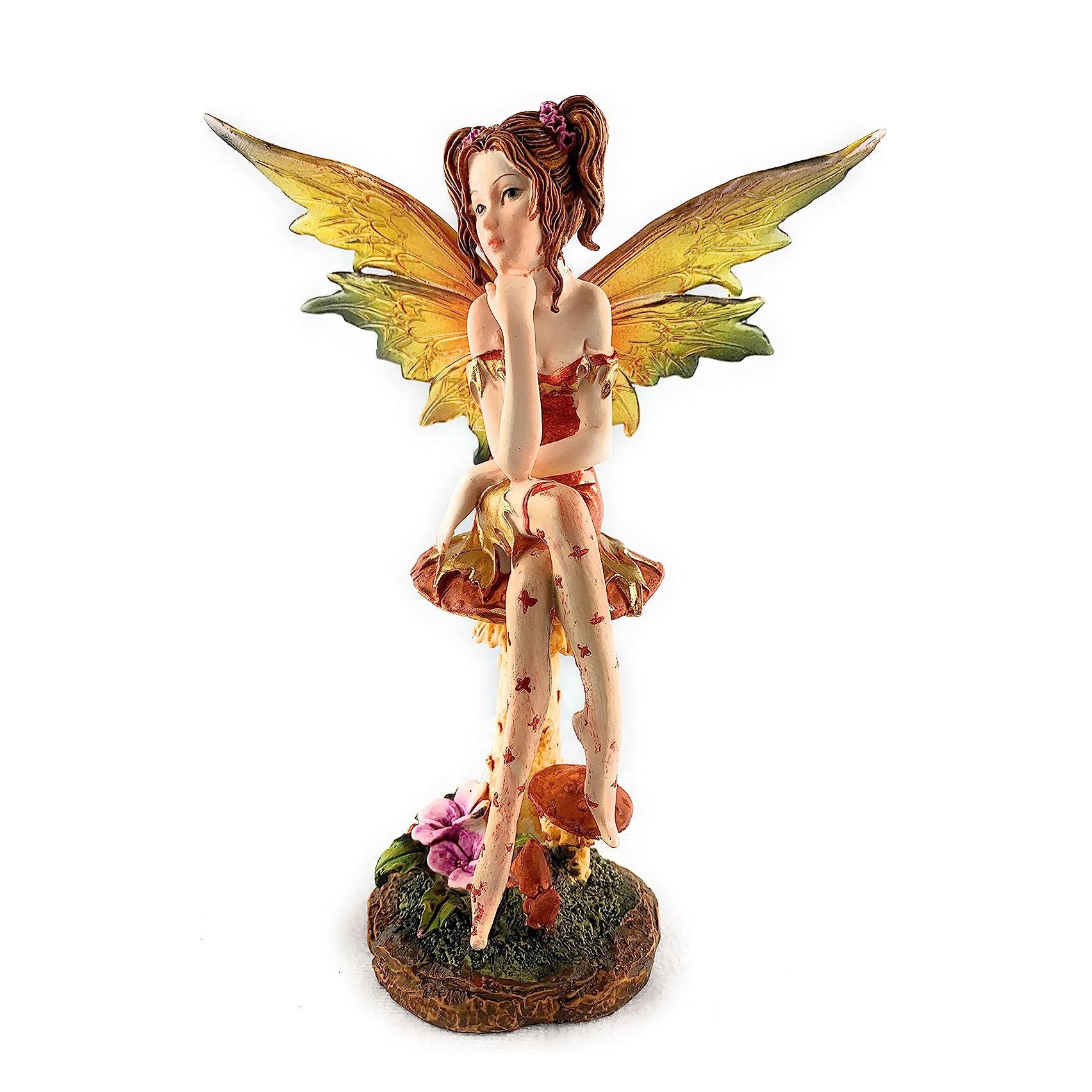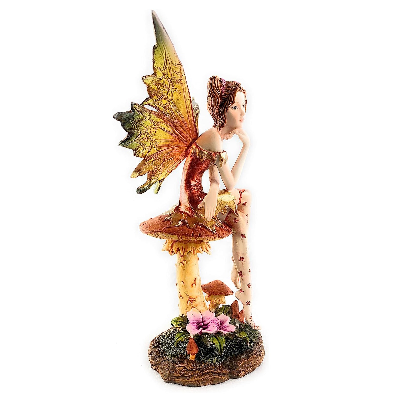 This delightful Fairy Figurine is perfect for boosting the coziness factor in your home. She's a great way to add a pop of orange and gold color, with her translucent wings and perched atop a mushroom, you'll be head-over-heels in love with her. She's the perfect sweet addition to your abode, and a brilliant gift for the Fairy-lovin' folks in your life!