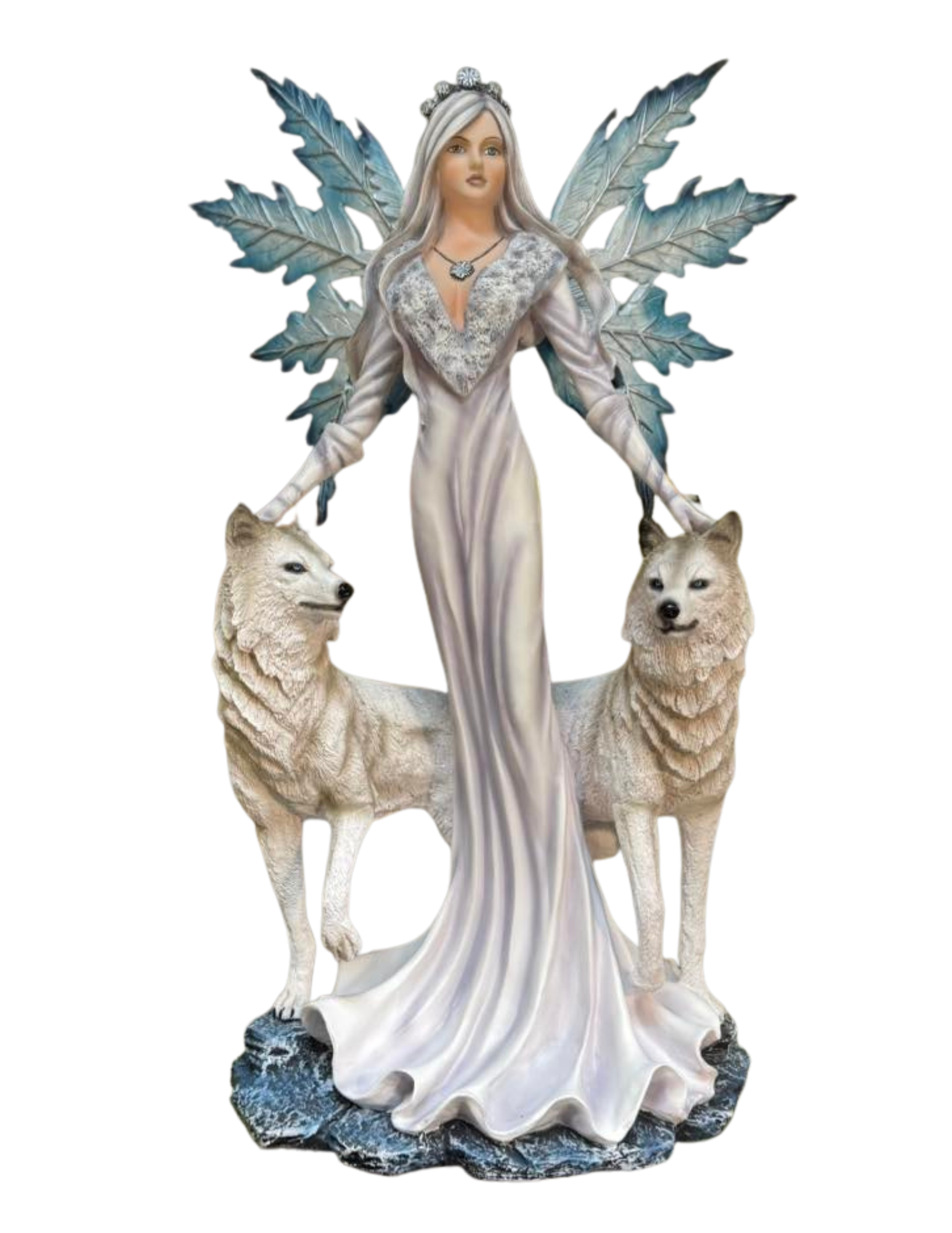 Immerse yourself in winter enchantment with this remarkable polyresin collectible. Rising nearly two feet in height, this handcrafted sculpture depicts a serene fairy dressed in an ivory gown with ethereal blue frost-flake wings, accompanied by two elegant white wolves in a harmonious composition.