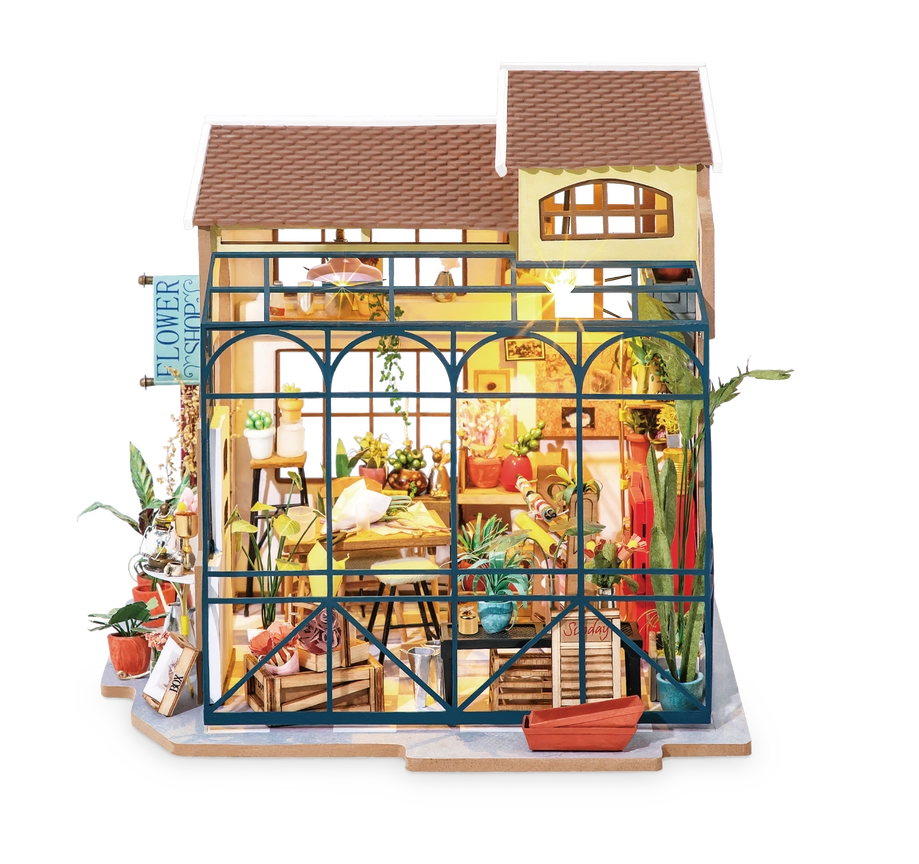 These DIY Miniature House Kits are perfect for craft lovers and anyone who dreams of their own little flower boutique! This Flower Shop kit features a charming storefront bursting with blooms, detailed displays, and cozy touches. Once built, use the touch button to control the tiny LED lights and bring your scene to life.