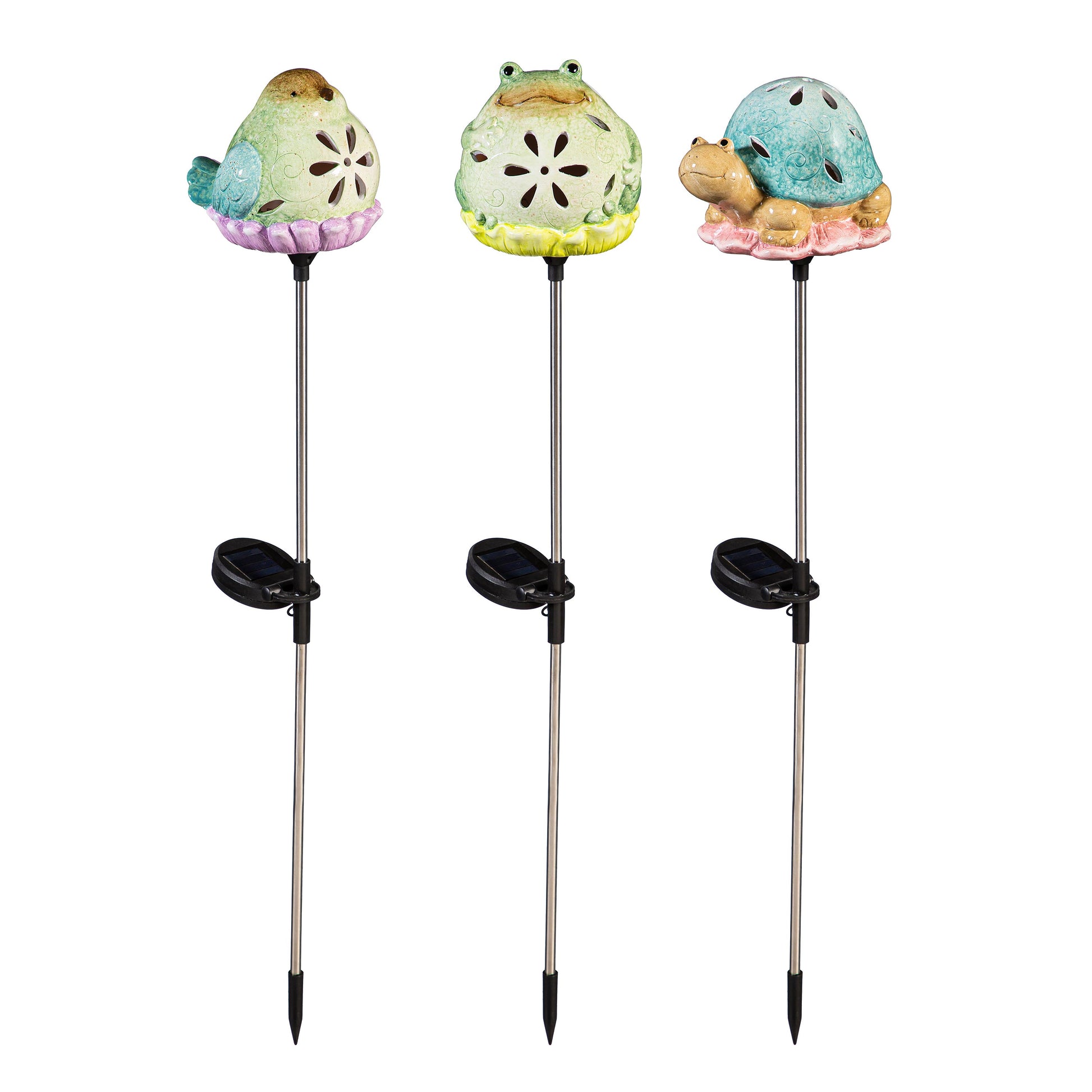 Brighten up your garden, yard, or walkway with this delightful solar stake set featuring three cute pals: a bird, a frog, and a turtle. They cast a gentle glow, adding a splash of color to your outdoor space. Made from weather-resistant materials, these stakes are perfect for any garden. Just let the solar panel soak up to six hours of sunlight for a charming nighttime shine. The sturdy H-stake makes it easy to place in soft or damp soil.