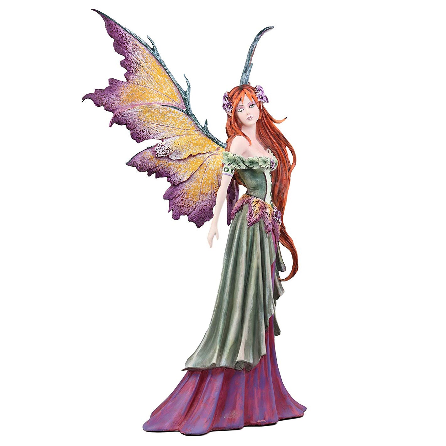 This gorgeous fairy is inspired by the artwork of Amy Brown! The pixie lady has leaf-like wings in shades of mauve and orange, and vibrant red hair. Her dress is a pale moss green, with a wine underskirt, and she is accented with leaves and flowers! Truly a magical collectible!