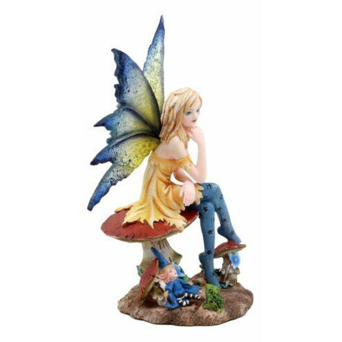 The whimsical magician fairy, based on the magical artwork of Amy Brown, is a petite fae dressed in a sunshine yellow frock, and blue flower-speckled leggings, with beautiful matching wings. She sits pensively atop a woodland mushroom, with a little magician pixie at her feet. A great collectible for any fairy fan!