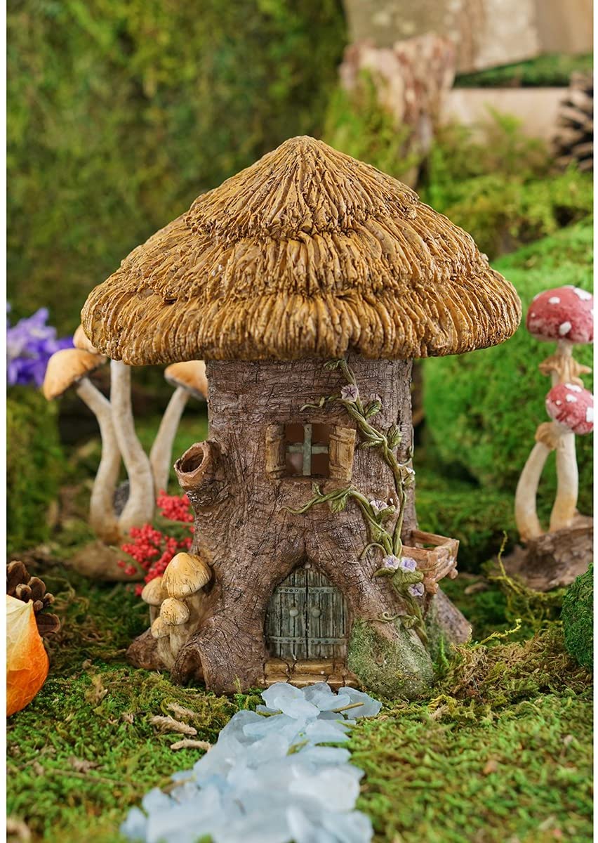 If you are looking to have a fairy call your garden their home, look no further than our Tree Stump Fairy House. This hand painted statue features a traditional thatched roof design, a garden bassinet, and a large double door. Running the length of this tree stump is a green vine with purple flowers and peaking out along the base are a few yellow mushrooms. Our cold cast resin statue is the perfect abode for your fairy garden and fits into a variety of locations. With some care and preparation, this statue can be displayed indoors or outdoors. Make this large tree stump fairy cottage a part of your garden and provide the perfect place for a fairy to call home.