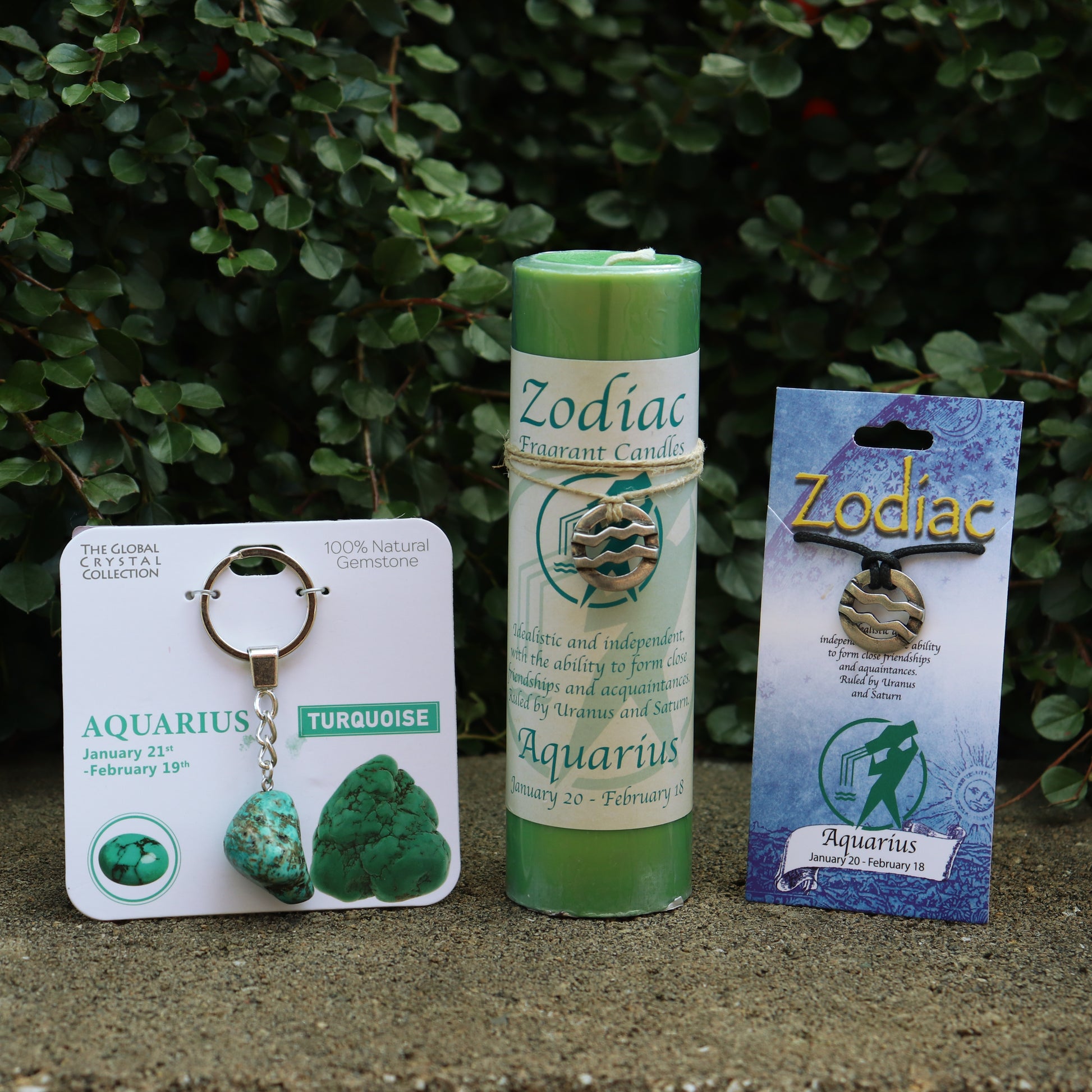 Celebrate your visionary Aquarius spirit with this Zodiac Gift Bundle. This set includes an Aquarius zodiac candle, pendant necklace, and a turquoise gemstone keychain—representing your originality, wisdom, and free-thinking soul.
