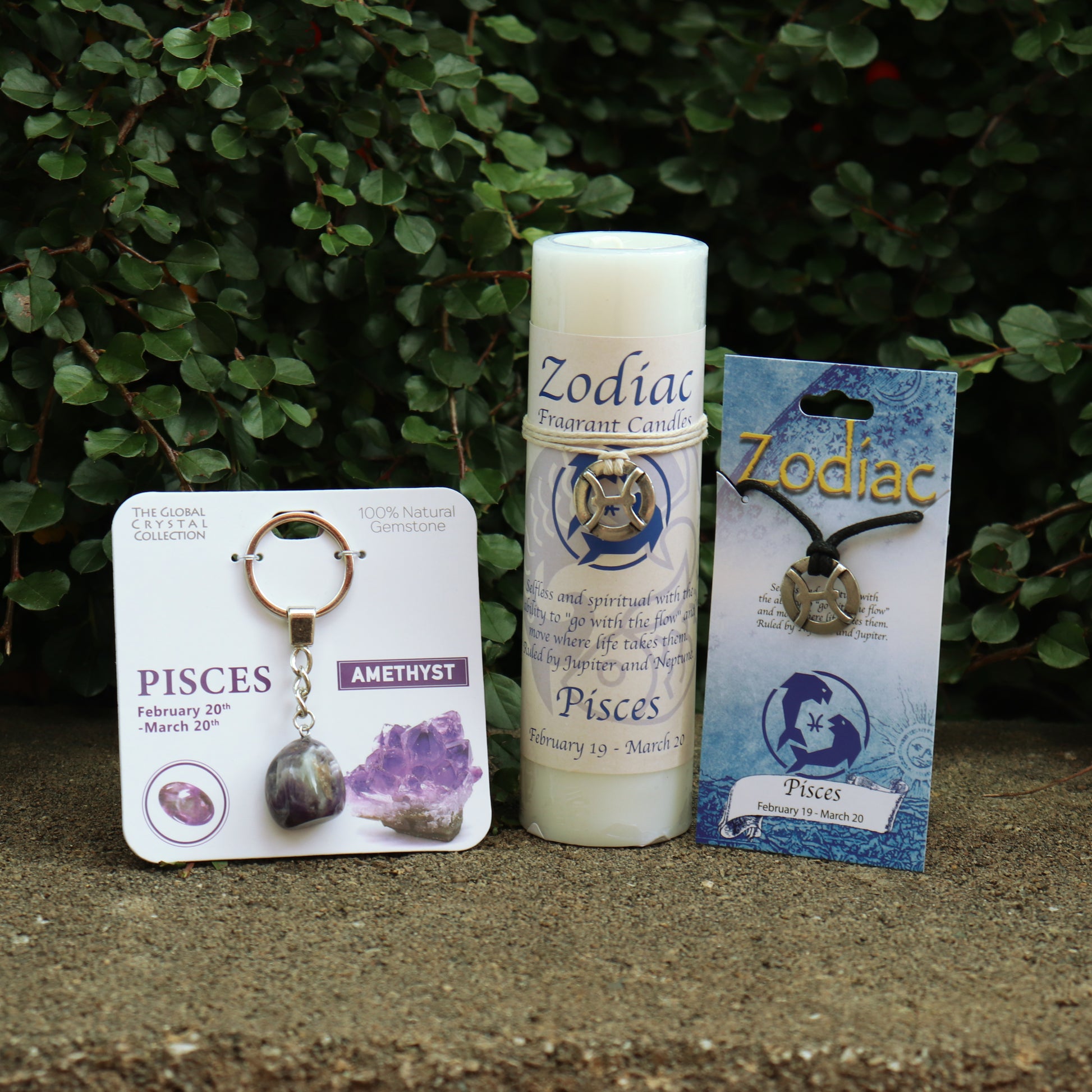 Connect with your dreamy Pisces energy through this Zodiac Gift Bundle. Featuring a Pisces zodiac candle, pendant necklace, and an amethyst gemstone keychain, this set highlights your intuitive, compassionate, and imaginative nature.